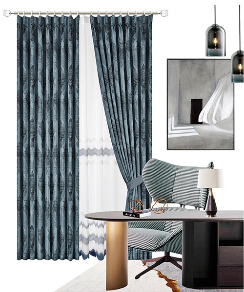灰藍色承載了灰色的沉靜高貴、藍色的優雅氣質,讓空間更具穿透力,簾身錯落有致的幾何圖案鋪陳簾身,賦予空間輕奢﹑雅致而舒適的生活氛圍。