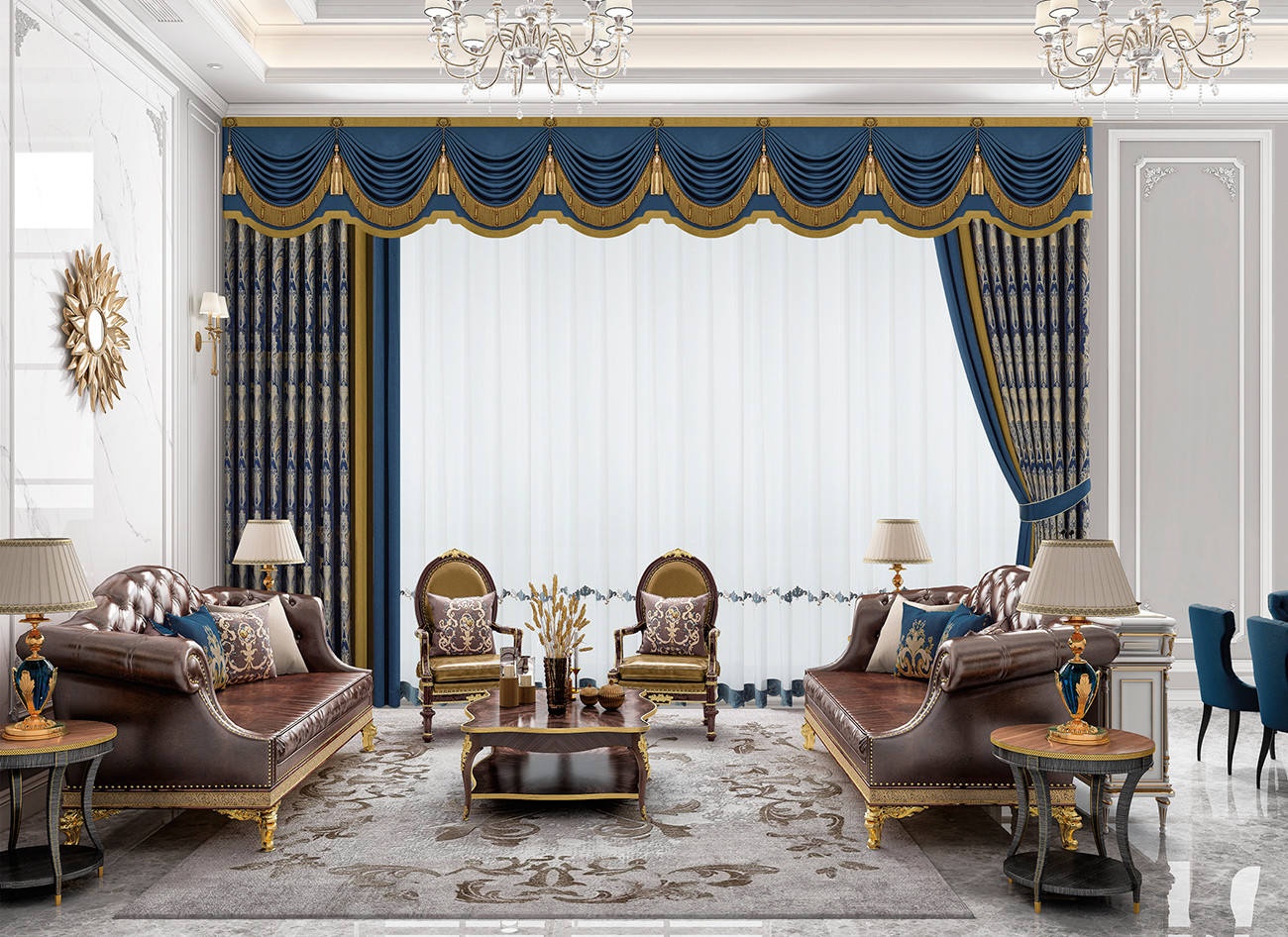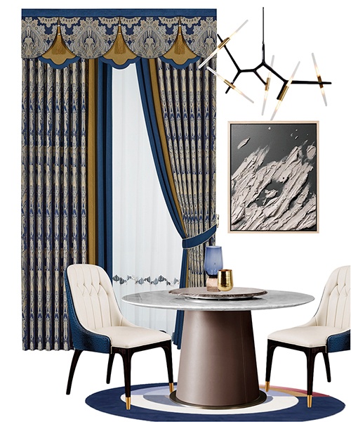 結合復古和摩登的設計靈感,大氣的歐花紋樣復刻懷舊,簡化的水波簾映射簡約,色彩端莊內斂,空間達成和諧統一的狀態。